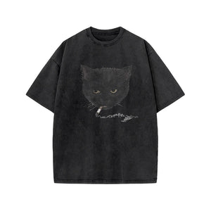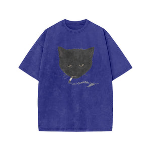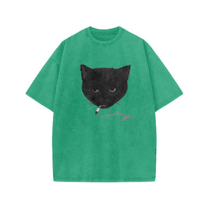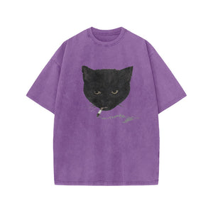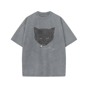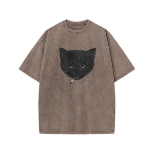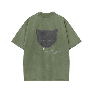 Unisex Smocking Cat Print Acid Washed T-shirt