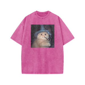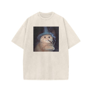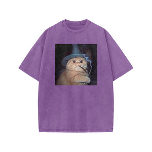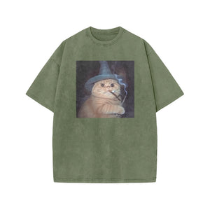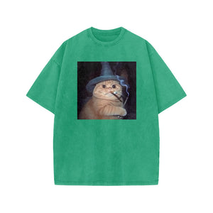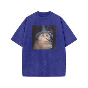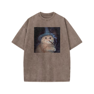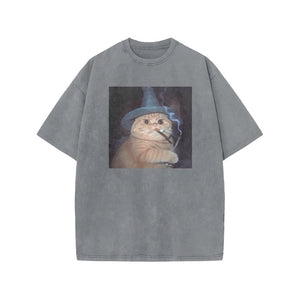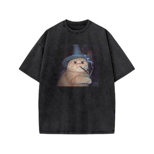 Unisex Smoking Wizard Cat Halloween Print Acid Washed T-shirt