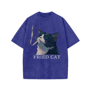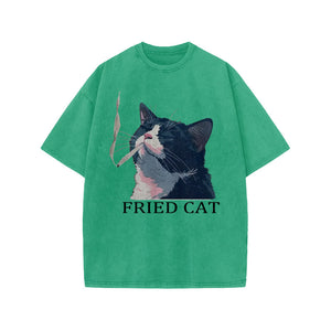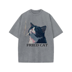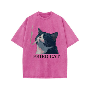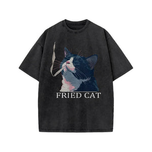 Unisex Fried Cat Print Acid Washed T-shirt