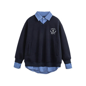 Unisex retro-style faux two-piece plaid patchwork collared sweatshirt