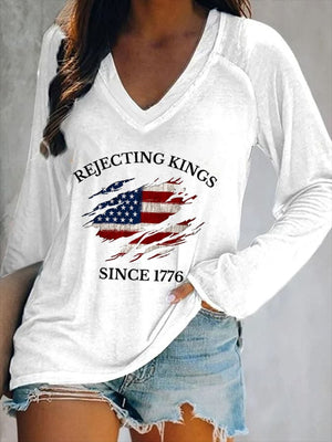 Women's “Rejecting Kings Since 1776” Printed V-Neck Casual T-Shirt